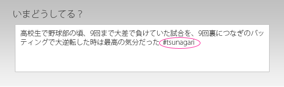 Twitterで下記画像のように、「#tsunagari」と付けてツイートするだけで応募できます。つぶやきの前につけても、後につけても大丈夫です。